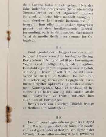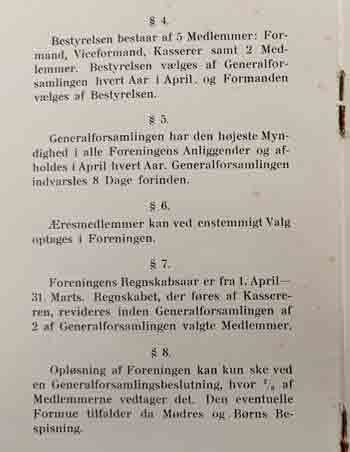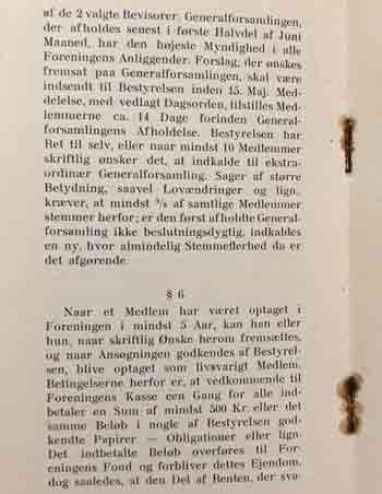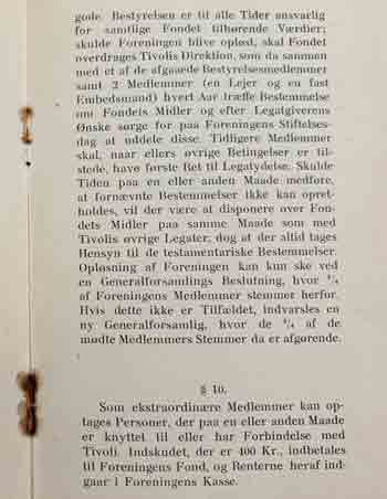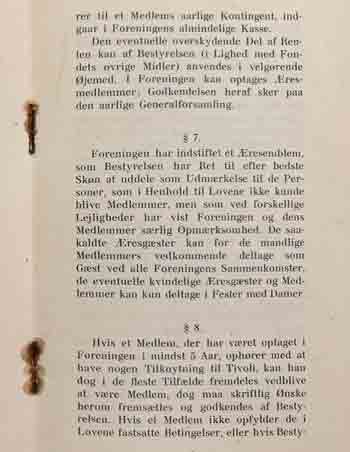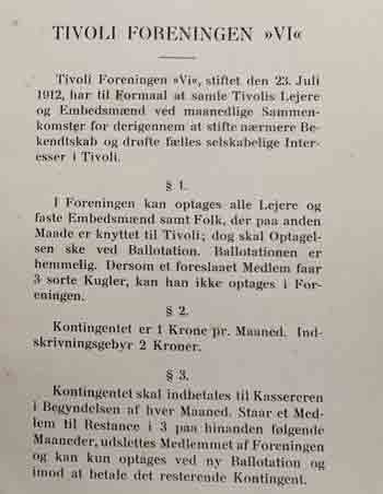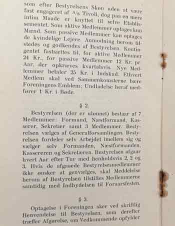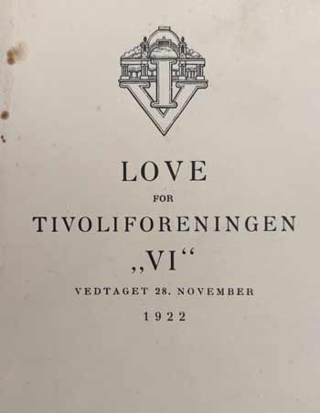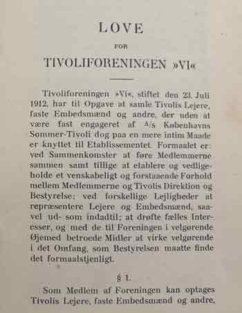 Vedtægts ændringer afskrevet af Dan Hilding Fotokomik i 2015 LOVE FOR TIVOLIFORENINGEN " VI " Tivoliforeningen " VI ", der er stiftet den 23. juli 1912, har til opgave at samle tivoli's lejere, embedsmænd og andre, der er fast engageret af A/S Kjøbenhavns Sommer-Tivoli eller på anden måde knyttet til etablissementet. Formålet er: At føre medlemmerne sammen samt at etablere og vedligeholde et venskabeligt og godt forhold mellem medlemmerne, Tivoli's direktion og bestyrelse. Ved forskellige lejligheder at repræsentere medlemmerne, og med de til foreningen i velgørende øjemed betroede midler at virke velgørende i det omfang, som bestyrelsen måtte finde dette formålstjenligt. § 1 Som medlem af foreningen kan, efter bestyrelsens skøn, optages Tivoli's lejere, embedsmænd og andre, som uden at være fast engageret af Tivoli, dog på en mere intim måde er knyttet til selve etablissementet. Som aktive medlemmer optages kun mænd. Som passive medlemmer kan optages de kvindelige lejere. Optagelse i foreningen sker ved henvendelse til bestyrelsen, der træffer afgørelse. Hvis optagelse ikke godkendes vil dette blive meddelt ansøgeren, som derefter kan indanke sagen for den førstkommende generalforsamling. § 2 Kontingent og indskud fastsættes på den årlige generalforsamling, og indbetales til kassereren. Bestyrelsen kan i særlige tilfælde fritage et medlem for kontingent. Æresmedlemmer betaler ikke kontingent. Står et medlem i restance udover et år betragtes han eller hun som udgået af foreningen. Udmeldelse skal ske skriftligt inden 1. december. § 3 Bestyrelsen består af formand og fire medlemmer, der vælges af den årlige generalforsamling. Valget er gældende for en 2-årig periode og bestyrelsen afgår efter tur med henholdsvis 2 og 3 medlemmer, men genvalg kan finde sted. Hvis de afgående bestyrelsesmedlemmer ikke ønsker genvalg, skal meddelelse herom gives medlemmerne samtidig med indkaldelse til generalforsamling. § 4 Foreningens regnskab er kalenderåret. Regnskabet skal inden forelæggelse på den årlige generalforsamling godkendes af bestyrelsen og revideres af 2 revisorer, der vælges for 1 år af generalforsamlingen. § 5 Generalforsamlingen har den højeste myndighed i alle foreningens anliggender, og skal afholdes hvert år inden udgangen af marts. Meddelelse om tidspunkt vedlagt dagsorden og revideret regnskab tilstilles medlemmerne senest 14 dage inden afholdelsen. Forslag, som af foreningens medlemmer ønskes behandlet på generalforsamlingen, må være bestyrelsens medlemmer i hænde senest 8 dage før. Valg til bestyrelsen, valg af revisor og lovændringer kan kun finde sted på en generalforsamling. Lovændringer kræver, at mindst 2/3 af de fremmødte medlemmer stemmer derfor. Bestyrelsen har ret til selv at indkalde til ekstraordinær generalforsamling, ligesom den har pligt hertil, når mindst 15 medlemmer skriftligt forlanger dette under angivelse af, hvad der ønsket forhandlet. § 6 Bestyrelsen kan udnævne æresmedlemmer og uddele foreningens ærestegn, ligesom bestyrelsen er bemyndiget til på foreningens vegne at repræsentere ved festlige lejligheder. Ved et medlems 25 års jubilæum i foreningen modtager jubilaren foreningens æresgave § 7 Hvis et medlem ophører med at have nogen tilknytning til Tivoli, kan han vedblive at være medlem, dog må ønske herom fremsættes til og godkendes af bestyrelsen. § 8 Opløsning af foreningen kan kun ske ved en generalforsamlingsbeslutning, hvis 3/4 af foreningens medlemmer stemmer herfor. Hvis dette ikke er tilfældet kan en ny generalforsamling indkaldes, hvor 3/4 af de fremmødte medlemmers stemmer er afgørende. Ved opløsning af foreningen overgår alle foreningens midler til Jul. Lachmanns legat. |